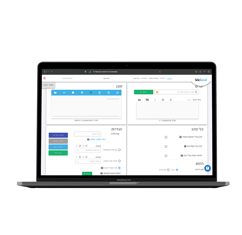 WeSend מעמידה לרשותך מערכת מתקדמת לתכנון והפצת המסרים השיווקיים שלך, לשמירה על קשר מתמשך עם הלקוחות שלך ולניהל אסטרטגיה שיווקית יעילה ומוצלחת מתמיד במחיר משתלם מאי פעם.